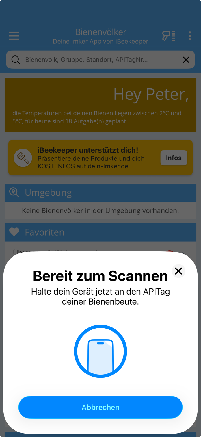 Um ein APITag/NFC oder QR-Code scannen zu können, muss dieser einem Volk zugewiesen sein